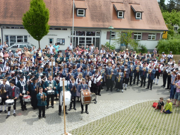 Am 9. Juni feierte der Musikverein Tannhausen sein 25-jähriges Bestehen. Morgens wurde in einem feierlichen Gottesdienst die neue Vereinsfahne gewiehen. An der Fahnenweihe nahm auch unsere Fahnenabordnung mit unserem Fähnrich Johann Preiß teil. Am Nachmittag kamen dann die benachbarten und befreundeten Musikkapellen aus Blönried-Zollenreute, Hoßkirch, Haisterkirch, Otterswang und die Stadtkapelle Aulendorf zu einem Sternmarsch zusammen. Natürlich nahmen auch wir hierbei teil. Nach und nach marschierten alle Kapellen auf dem Dorfplatz ein und als Höhepunkt folgte der Einmarsch der Jubelkapelle mit ihrer neuen Vereinsfahne. Anschließend spielten alle Musikkapellen zusammen einen Gesamtchor auf dem Dorfplatz bevor es mit einem Fahneneinmarsch in den Feststadel ging.