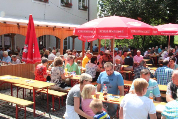 Um die Mittagszeit waren dann alle Bänke und Plätze belegt. Schattenplätze unter den Lindenbäumen und unter den großen Sonnenschirmen waren besonders gefragt, denn die Sonne überstrahlte den gesamten Burghof und heizte diesen kräftig auf. Auch Bürgermeister Roland Weinschenk und Gattin wie zahlreich Gekommene ließen sich den allseits gelobten, reichhaltigen, schwäbischen Mittagstisch mit frischen Salaten, Spätzle und Schweinehals schmecken. Wer dann noch das Kuchenbuffet mit der prachtvollen Auswahl von Torten und Kuchen zu sehen bekam, konnte dem süßen, selbstgebackenen Angebot einfach nicht widerstehen.