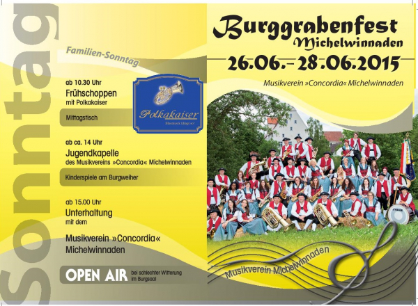 Noch beflügelt vom gelungenen 100-jährigen Vereinsjubiläum veranstaltet der Musikverein »Concordia« Michelwinnaden e.V., vom 26.06. – 28.06.2015 das traditionelle Burggrabenfest. Am Freitagabend startet das Fest um 19.00 Uhr mit einer Afterwork Party im Burghof unter dem Motto „BURG MEETS BEATS – die Afterwork Party Oberschwabens“. Für die fetten Beats im Burghof sorgen DJ SonThec & DJ TowBeat bereits ab 19.00 Uhr. Der Eintritt kostet 4,00 €. Es lohnt sich jedoch früh zur Afterwork Party zu kommen, denn Jeder, der vor 21.00 Uhr in den Burghof kommt, erhält einen Verzehrgutschein im Wert von 2,00 €. Jugendliche unter 18 Jahren erhalten nur unter Vorlage des Partypasses Einlass in den Burghof.