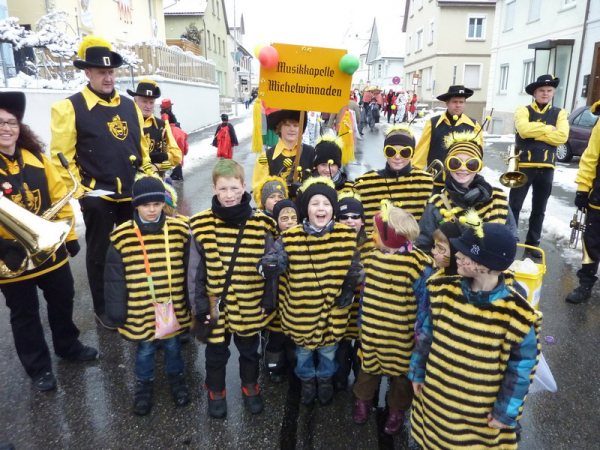 Aus und vorbei, die Fasnet 2013. Kurz und knackig war sie und mit einer Neuerung für den Musikverein. Heuer sind zum ersten Mal die Kleinsten bei den Umzügen in Reute,Bad Waldsee und Aulendorf mitgelaufen. Farbig passend zu den Uniformen sind sie in schwarz/ gelb als Bienchen verkleidet dem Musikerschild hinterher gelaufen, mal als wilder Bienenhaufen, mal schön geordnet wie die Musikanten. Ach ja, und in Michelwinnaden gabs noch einen neuen Musikanten: Gere, der Tanzbär! Lustig wars auf alle Fälle und wir freuen uns schon auf 2014, denn da wird’s eine ganz lange Fasnet!!