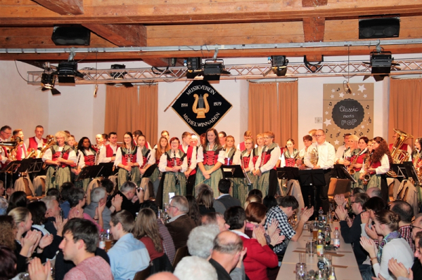 Nach der Pause widmete sich die Musikkapelle der Popmusik. Gestartet wurde mit dem Konzertwerk „African Symphony“ von Van McCoy. Der Song „Purple Rain“ des amerikanischen Musikers Prince wurde in den 1980er-Jahren weltberühmt. Der Arrangeur Heinz Briegel bearbeitete den Erfolgstitel für Blasorchestter und fügte ein Solo für Alt-Saxofon hinzu. Carolin Käppeler war eigens für den Solovortrag auf einen Hocker geklettert, brillierte glänzend mit sauberen Saxofon-Klängen und erntete Riesenapplaus, während die Kapelle als Rockband begleitete. Heftiges Beifallklatschen und Bravo-Rufe galten dann auch Franz Schwägler und Tochter Franziska für ihr Glanzleistung beim volkstümlichen Solostück „Silberne Trompeten“ von Zdenek Gursky.