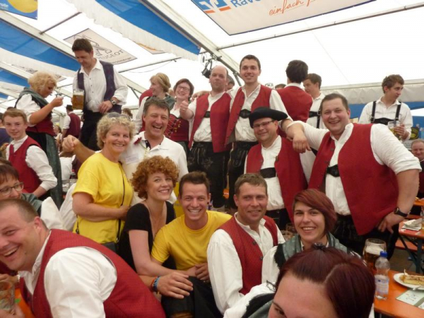Nicht weniger schwitzen mussten wir am nächsten Tag beim Kreismusikfest in Bergatreute. Sehr gefreut hatten wir uns über die Einladung unseres “Festgettes” Volker Ertner, welcher uns vor dem Umzug zu sich in den Carport eingeladen hatte. Mit Marschmusik kamen wir bei seinem Haus an und wurden dort von ihm und seiner Tochter mit kühlen Getränken und Saiten empfangen. So konnten er uns und wir ihn in Ruhe kennenlernen und zum Abschluss spielten wir ihm natürlich nochmals etwas. Anschließend zogen wir los zum Gesamtchor und zum Festumzug, bei welchem uns Volker Ertner natürlich wieder begleitet. Am Zelt angekommen versorgte uns unser “Festgette” mit kühlen Getränken und bei ausgelassener Stimmung warten wir auf den Fahneneinmarsch. Wir möchten uns nochmals bei der Familie Ernter für den netten Nachmittag sowie für die ausgegebenen Getränke bedanken. Das Kreismusikfest Bergatreute wird dadurch in noch schönerer Erinnerung bleiben.