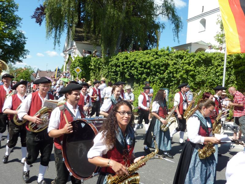 Nicht weniger schwitzen mussten wir am nächsten Tag beim Kreismusikfest in Bergatreute. Sehr gefreut hatten wir uns über die Einladung unseres “Festgettes” Volker Ertner, welcher uns vor dem Umzug zu sich in den Carport eingeladen hatte. Mit Marschmusik kamen wir bei seinem Haus an und wurden dort von ihm und seiner Tochter mit kühlen Getränken und Saiten empfangen. So konnten er uns und wir ihn in Ruhe kennenlernen und zum Abschluss spielten wir ihm natürlich nochmals etwas. Anschließend zogen wir los zum Gesamtchor und zum Festumzug, bei welchem uns Volker Ertner natürlich wieder begleitet. Am Zelt angekommen versorgte uns unser “Festgette” mit kühlen Getränken und bei ausgelassener Stimmung warten wir auf den Fahneneinmarsch. Wir möchten uns nochmals bei der Familie Ernter für den netten Nachmittag sowie für die ausgegebenen Getränke bedanken. Das Kreismusikfest Bergatreute wird dadurch in noch schönerer Erinnerung bleiben.