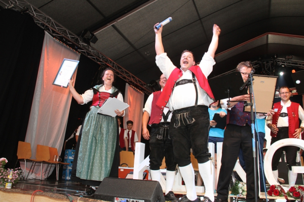 Am Sonntag nach einem gelungenen Gesamtchor und einem schönen Umzug ging es dann zur großen Musikerparty in das Festzelt. Die Musiker aus Kressbronn heizten den vielen feiernden Musikern im Festzelt mächtig ein und fast das komplette Zelt stand auf den Tischen und Bänken. Ein besonderes Highlight war aber sicherlich der Fahneneinmarsch bei dem alle Musiker den Einmarsch ihrer Vereinsfahne bejubelten. Dann stieg die Spannung, denn danach stand die Bekanntgabe der Wertungspiele auf dem Programm. Der Vorsitzende des Blasmusikkreisverbandes Rudi Hämmerle gab die Ergebnisse bekannt und lobte hierbei Karin Michele-Klösges für deren mutige Entscheidung nach langer Wertungsspielabstinenz in der Wertungskategorie Oberstufe anzutreten. Er belohnte ihre Entscheidung mit der Note „Sehr gut“. Freudestrahlend und jubelnd nahmen Dirigentin Karin Michele-Klösges und Vorstand Johannes Hepp auf der Bühne die Urkunde entgegen und wurden dann im Zelt von ihren jubelnden Musikern empfangen.